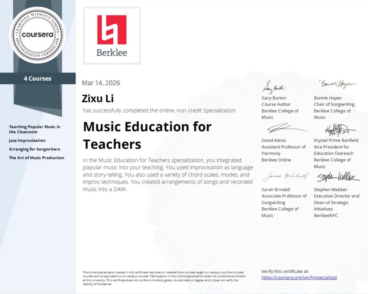 作为深耕箜篌领域的青年演奏家,李子旭始终致力于传统乐器的当代传承与创新教学。此次他系统研习了《课堂流行音乐教学》《爵士即兴》《词曲作者编曲》《音乐制作的艺术》四门核心课程,将国际前沿的音乐教育理念、即兴创作方法与数字音频制作技术进一步融入箜篌教学与人才培养中,实现了传统器乐教学与国际现代音乐教育体系的深度融合。